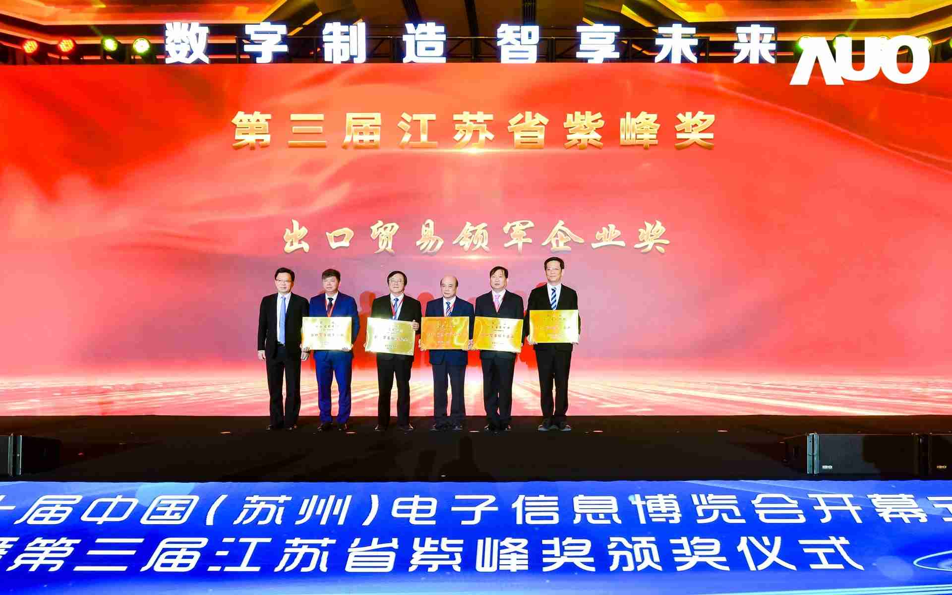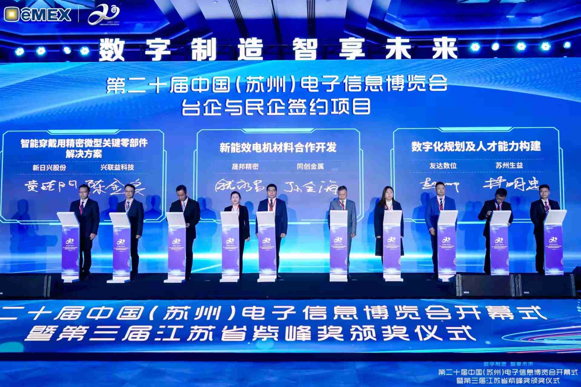 电博会开幕式当天也是第三届江苏省紫峰奖颁奖仪式,,,,省台办、、、工信厅、、、商务厅、、、苏州市相关领导均出席并颁奖。。。该奖项为表彰对江苏高质量发展做出积极贡献的在苏企业,,,,由江苏省政府专门设立。。。。尊龙z6光电 (苏州) 总经理郭振明代表上台领奖,,这也是尊龙z6苏州连续三次蝉联紫峰奖 出口贸易领军企业奖。。。尊龙z6数位总经理赵丽娜女士,,,,也参与本次开幕式,,,,上台为本地化赋能签署战略合作协议,,,,将优质服务资源集合、、下沉到更多细分行业,,为更多地区的制造企业提供数字化转型服务。。。。
